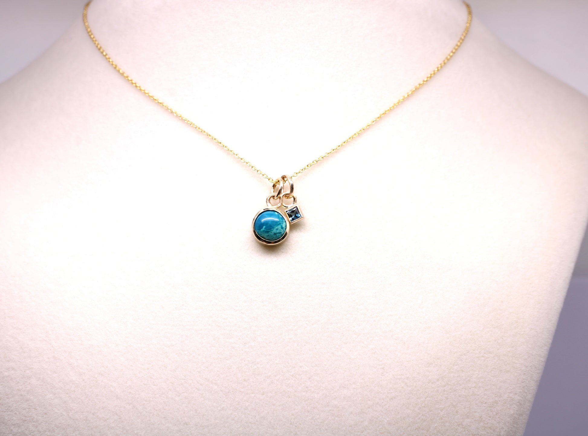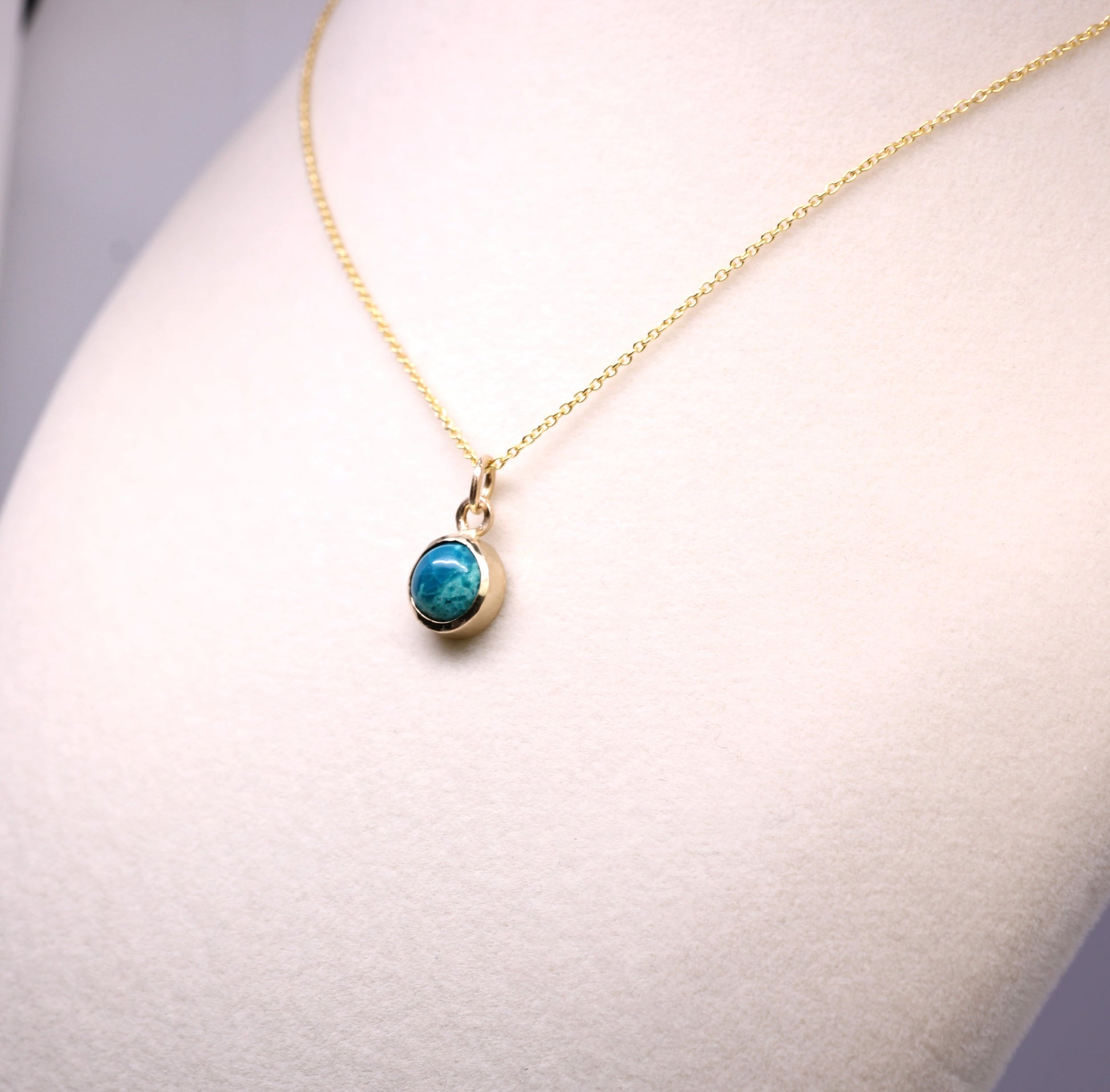 Handcrafted in solid 14K gold, this Unique Gemstone pendant features a luminous 8mm Chrysocolla cabochon in a minimalist open-back setting. Each piece is made to order in my Sparks, Nevada studio using natural Colored Stones and traditional techniques.